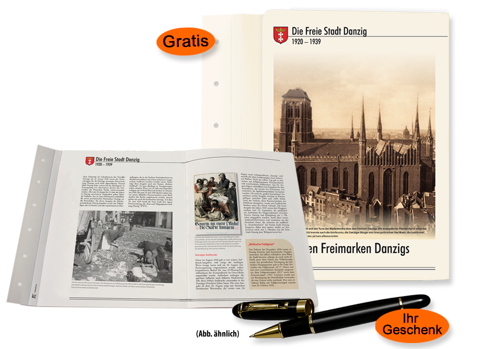 Damit sichern Sie sich außerdem das exklusive Anrecht auf die weiteren Lieferungen der Kollektion „Freie Stadt Danzig 1920–1939“. Die Briefmarken werden Ihnen alle drei bis vier Wochen in postfrischer oder gestempelter Luxus-Erhaltung für nur 14,95 € (statt 43,50 € im Einzelverkauf) unverbindlich vorgelegt.